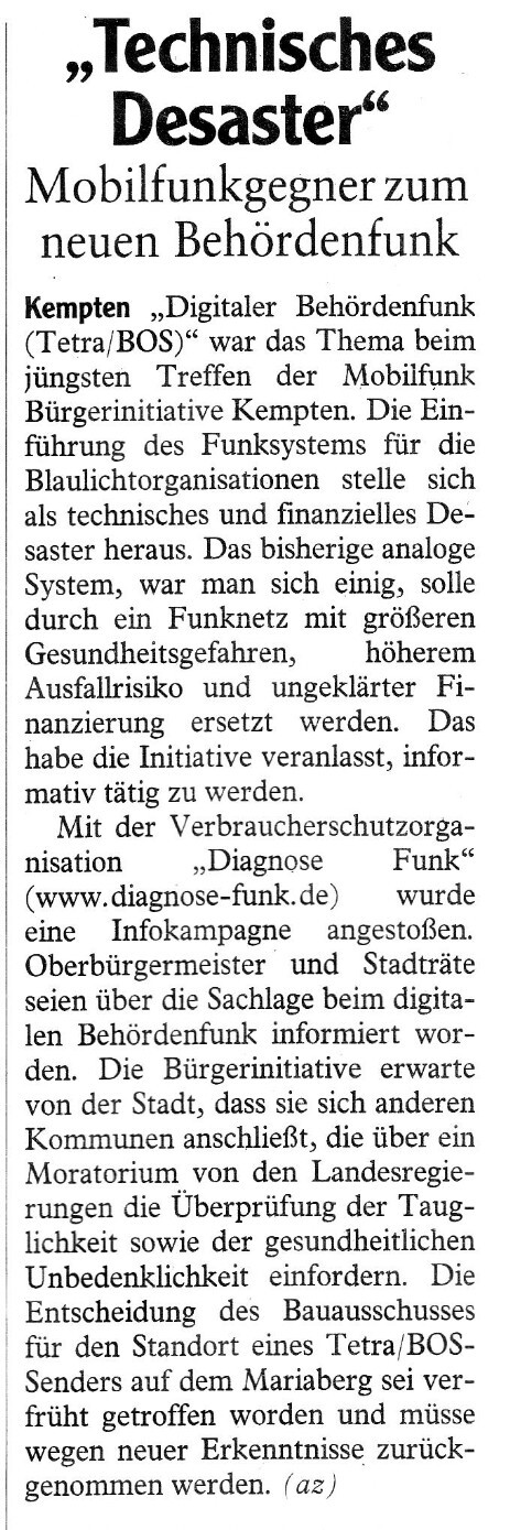 Allgäuer Zeitung 16.04.12 - Risiko Mobilfunk Kempten